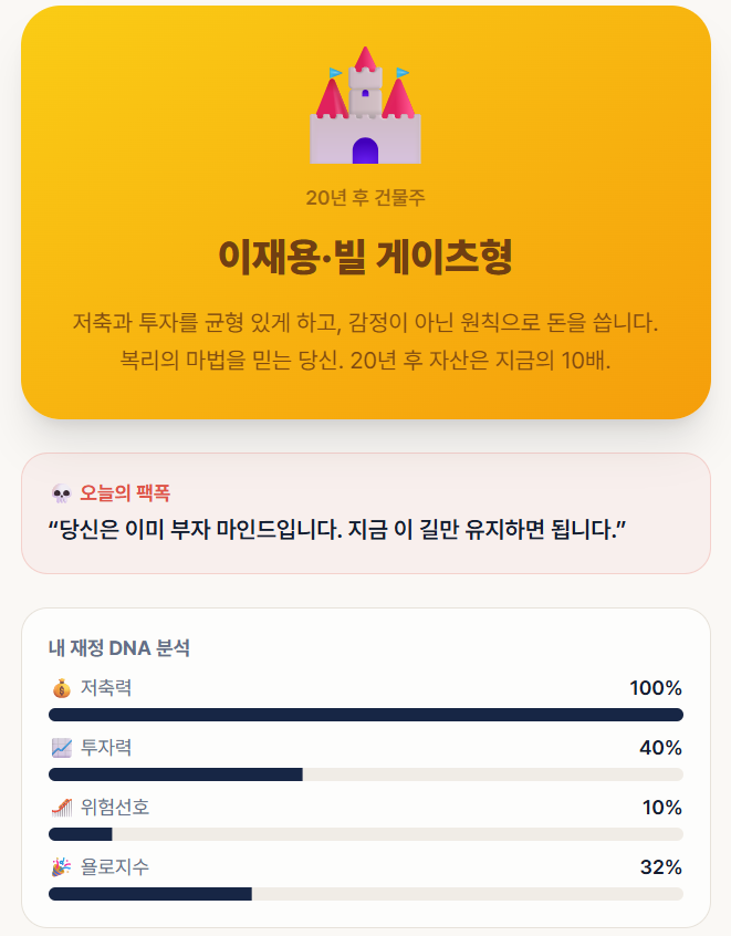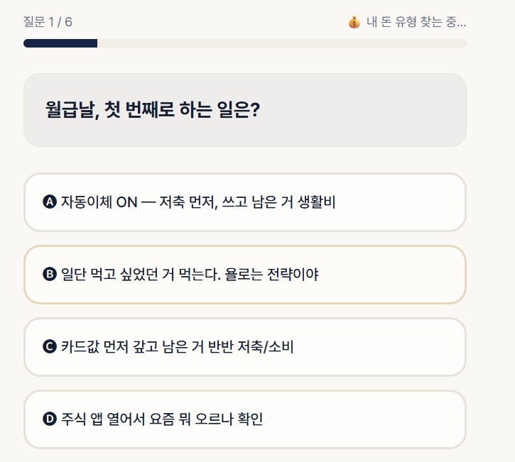각 선택지마다 점수가 매겨지고, 6문항을 모두 답하면 **5가지 머니 타입 중 하나**로 결과가 나옵니다.
